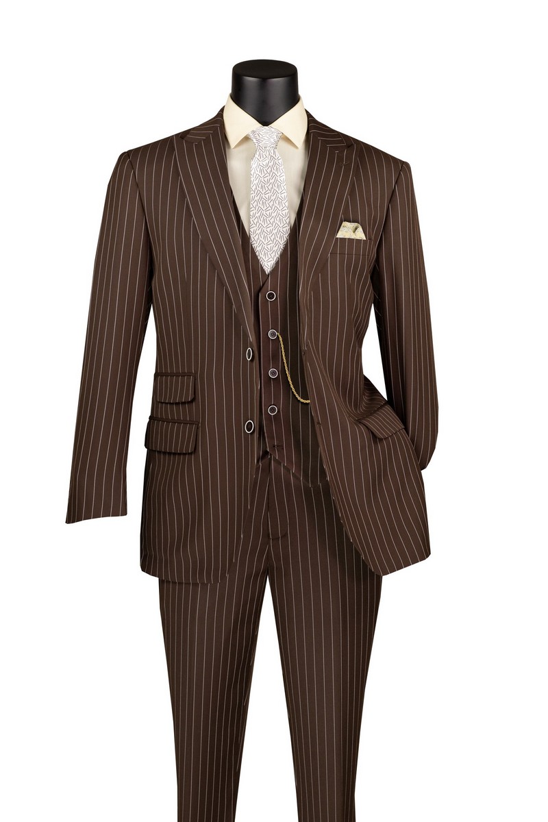 Double breasted, peak lapel, side vents, flat front pants.