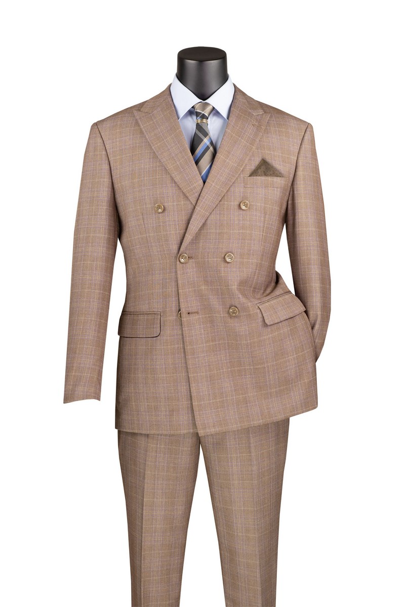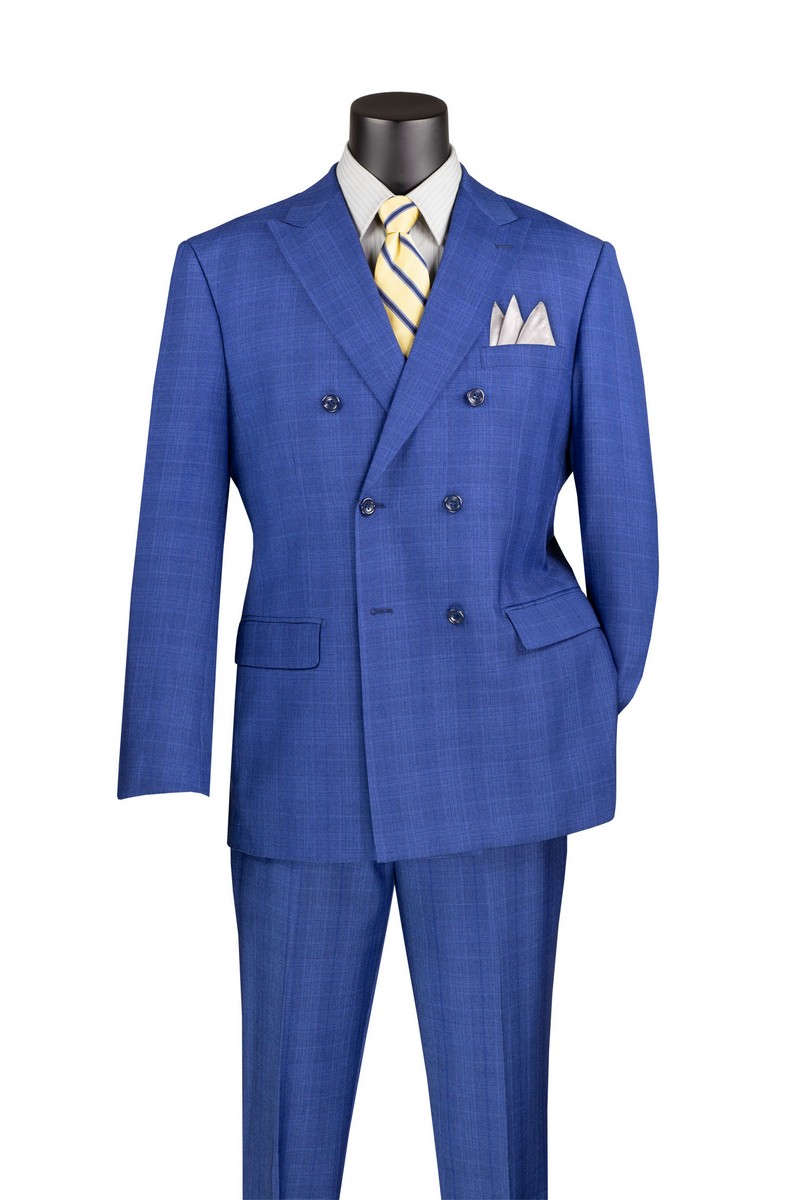 Double breasted, 6×2, peak lapel, side vents, flat front pants.