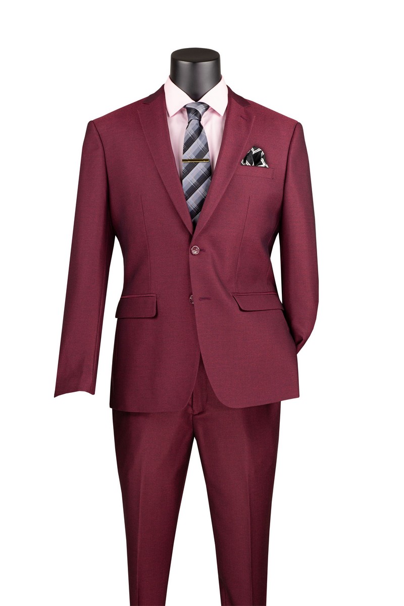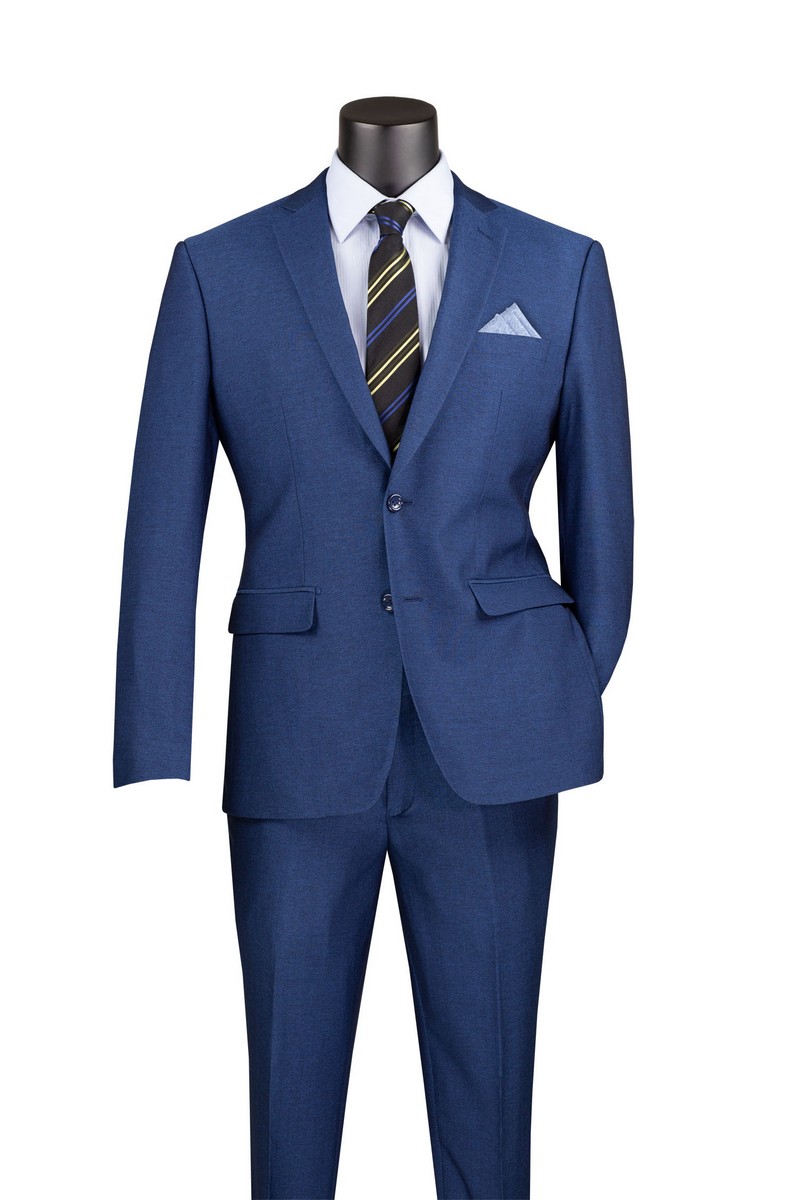 Single breasted 2 buttons, slim fit notch lapel suit, Side vents, flat front pants, textured weave.