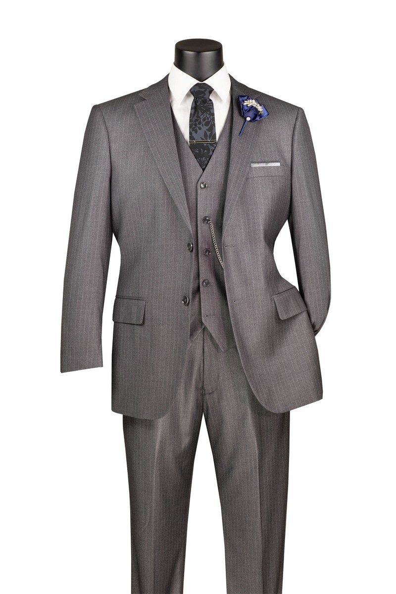 Single breasted 2 buttons, 3 pcs vested suit, center vent, flat front pants.