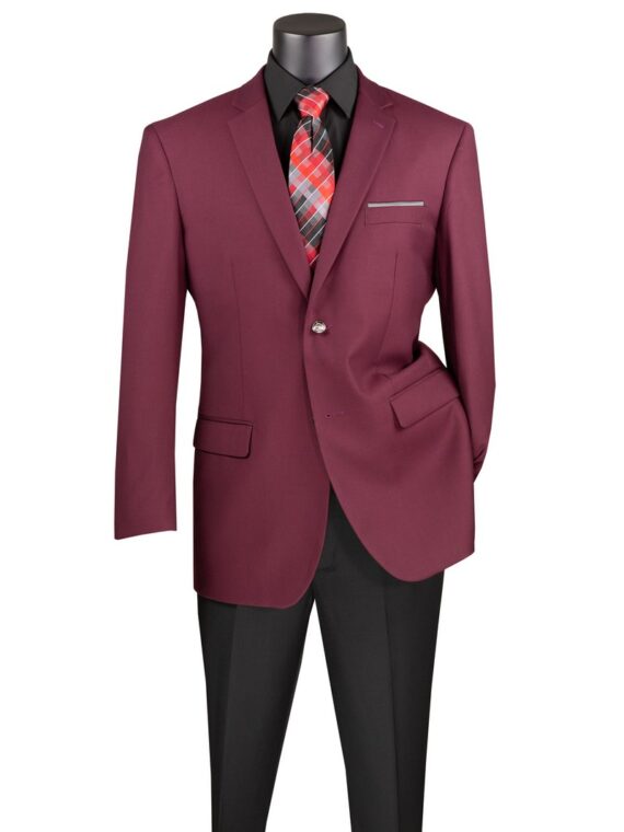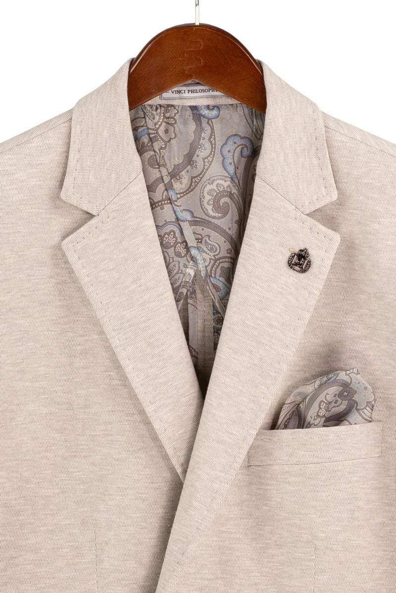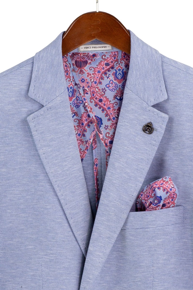 Single breasted 2 buttons, Modern fit stretch jacket with stitched lapel. Center vent. Fancy half lining and built-in pocket square. Complimentary lapel pin.
